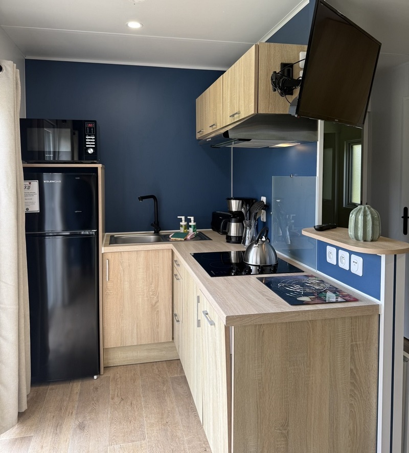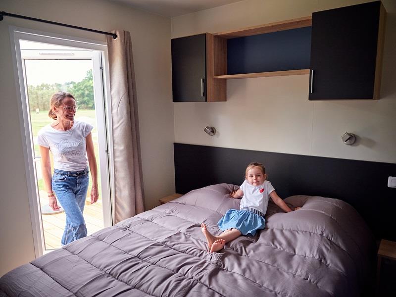 At the Domaine de Kervallon in Caro in Southern Brittany, discover our numerous Breizh homes which will offer you all the space, comfort and Breton authenticity you dream of. This large 37m2 mobile home can accommodate up to 6 people and offers a bright living room and a fully equipped modern kitchen, both accessible through a large bay window from your private terrace, close to our new arrivals: two alpacas and two black noses of the Valais! Enjoy exceptional comfort during your stay, particularly thanks to the kitchen which provides everything you need: fridge, ceramic hob, dishwasher, microwave, electric coffee machine, etc.