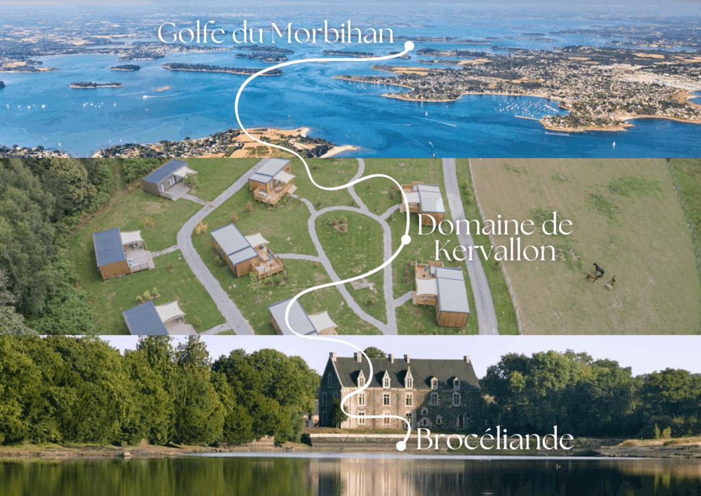 Domaine De Kervallon, een 4-sterren residentieel recreatiepark in Morbihan, biedt 125 staanplaatsen : comfortabele chalets, stacaravans, Mongoolse yurts, hutten, standplaatsen voor tenten of campers, safaritenten en huisjes op 4 meter hoogte, met kamers die een ononderbroken uitzicht op het omliggende platteland bieden.